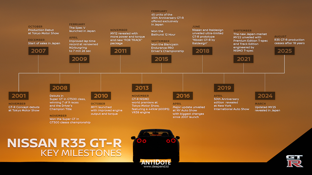 R35 dikenal karena pendekatannya yang unik: bukannya facelift besar, Nissan memilih menyempurnakannya setiap tahun. Mulai dari naiknya tenaga mesin VR38DETT twin-turbo V6 hingga lahirnya varian GT-R NISMO dengan teknologi turunan balap. Dari awalnya 480 PS, tenaganya terus dikatrol hingga 600 PS.