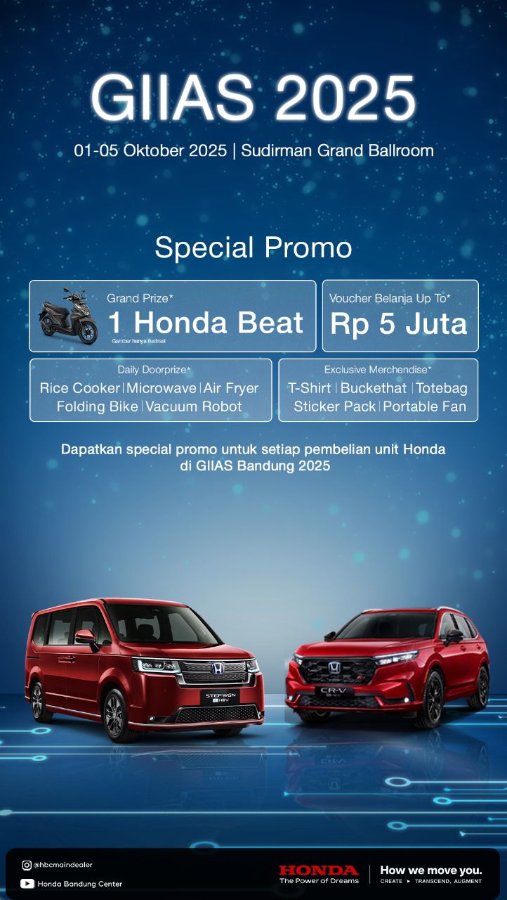 Tak hanya pameran produk, Honda juga menghadirkan program penjualan spesial selama GIIAS Bandung 2025. Pengunjung berkesempatan memenangkan Grand Prize berupa 1 unit Honda BeAT, voucher belanja senilai total lebih dari Rp100 juta, daily doorprize berupa perlengkapan rumah tangga, hingga merchandise eksklusif. Program ini menjadi daya tarik tambahan bagi calon konsumen yang ingin memiliki mobil hybrid Honda.