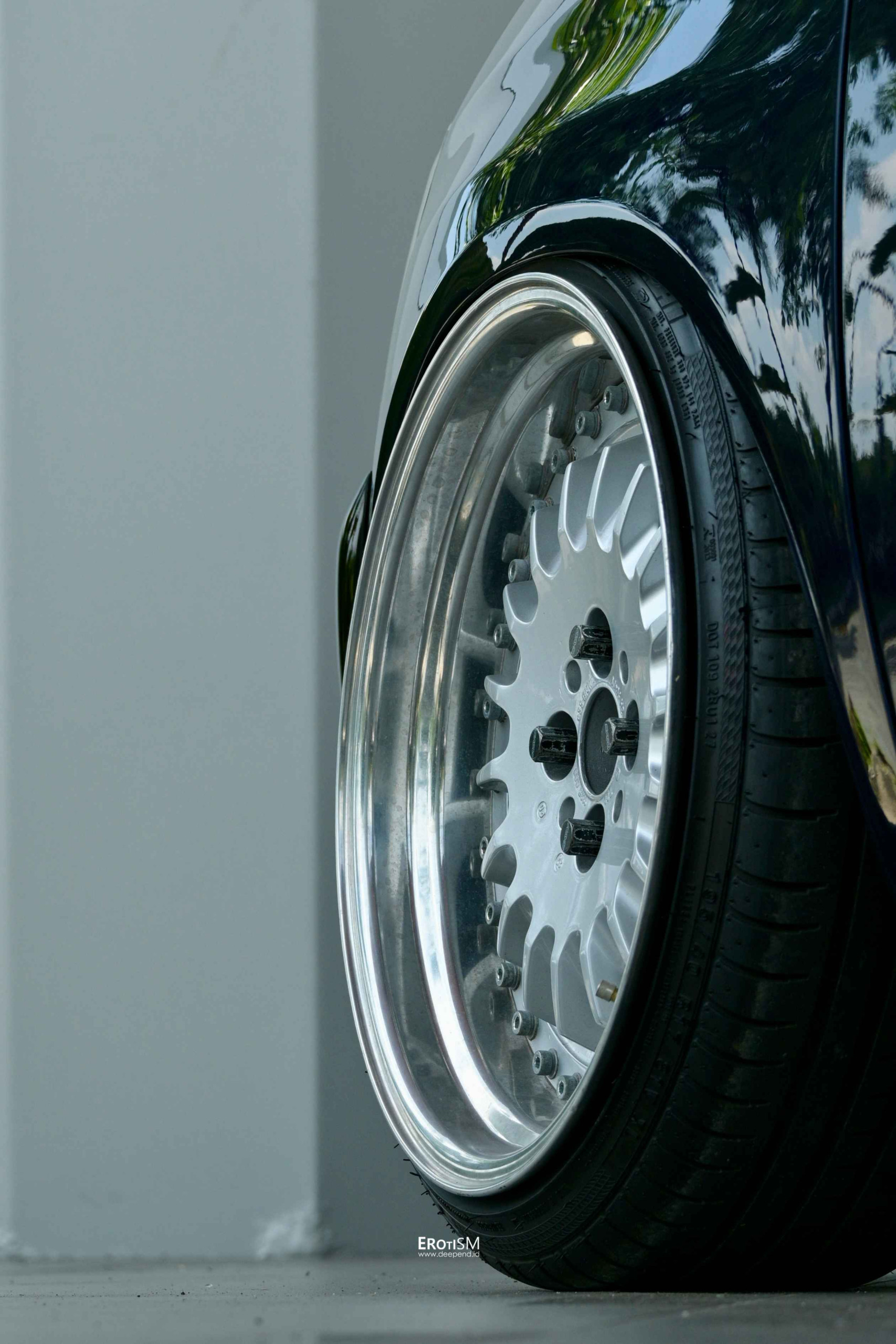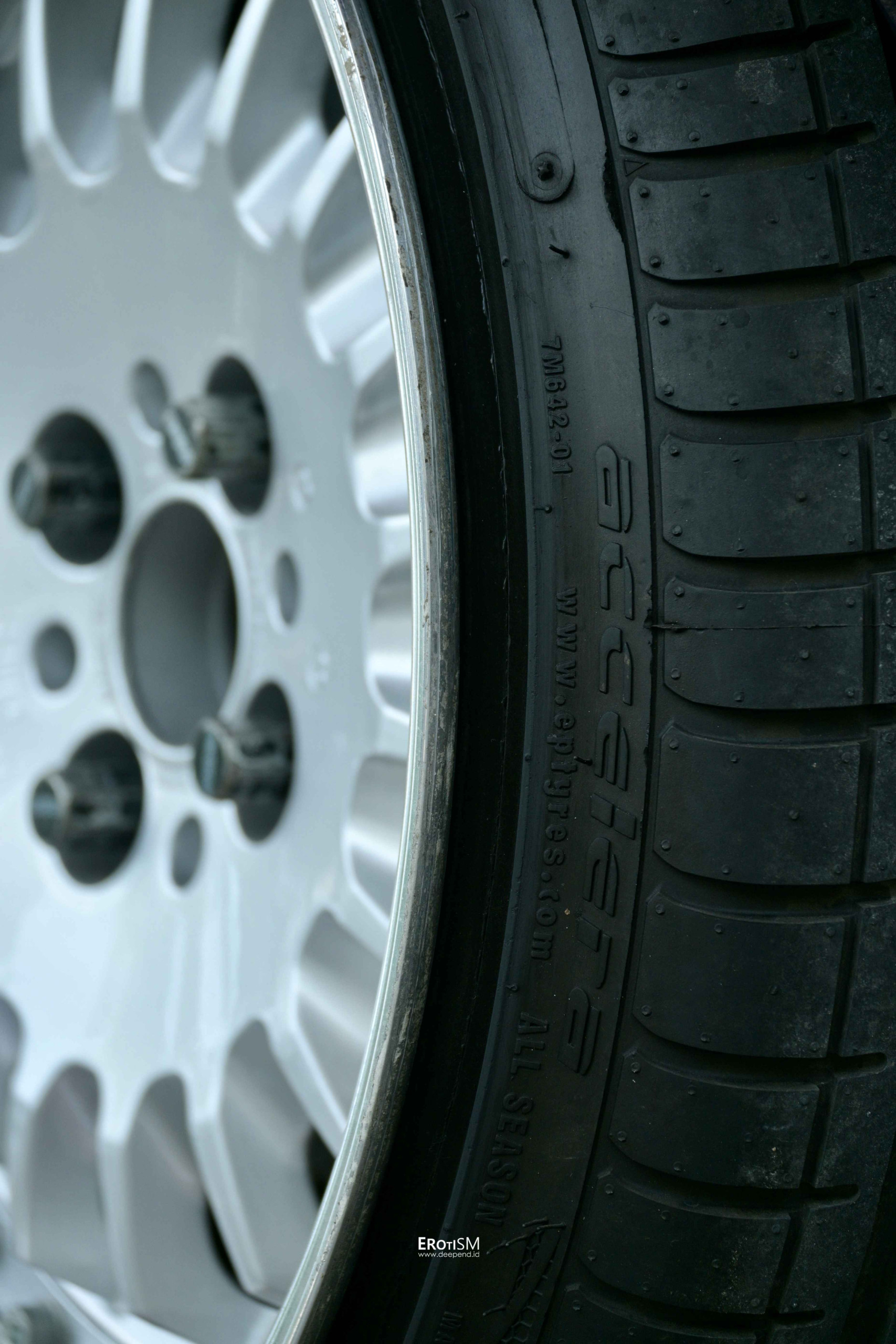 Velgnya nggak kalah gila. Hasil custom dari face BMW E30 R14, di-step up ke R17 dengan lebar 8,5–10 inci. Ban yang membungkusnya pun tipis-tipis: Accelera Phi 195/40R17 depan dan 225/35R17 belakang.