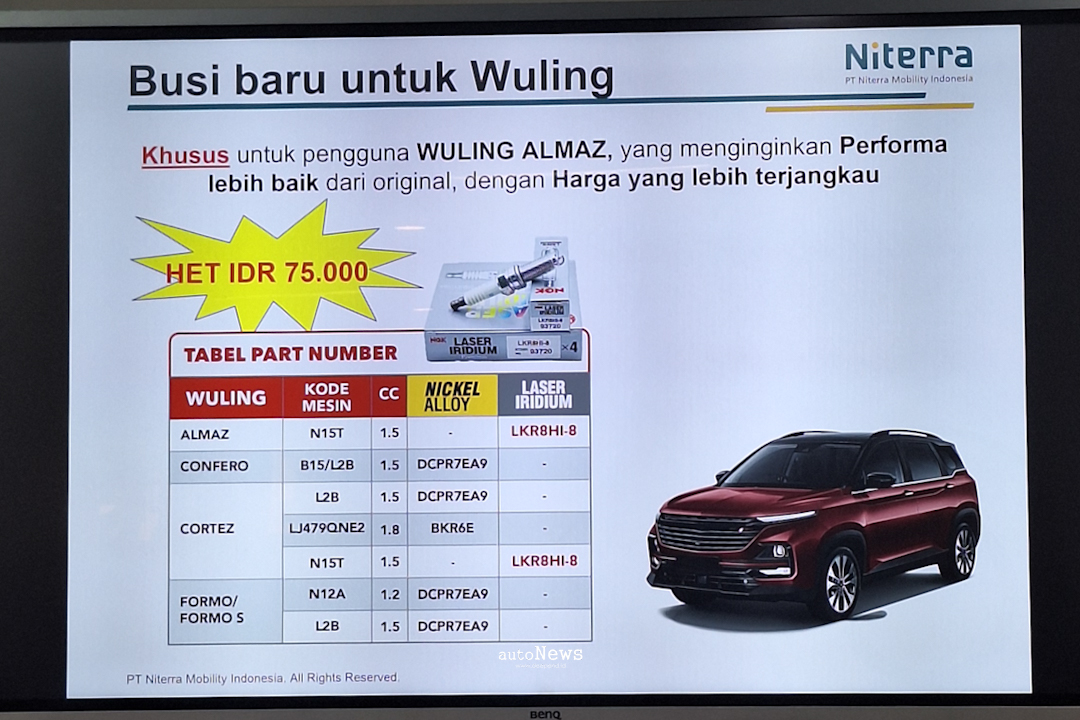 Selain Laser Iridium untuk Almaz dan Cortez, Niterra juga menyiapkan pilihan busi lain berbahan nickel alloy untuk model Wuling lain seperti Confero dan Formo.