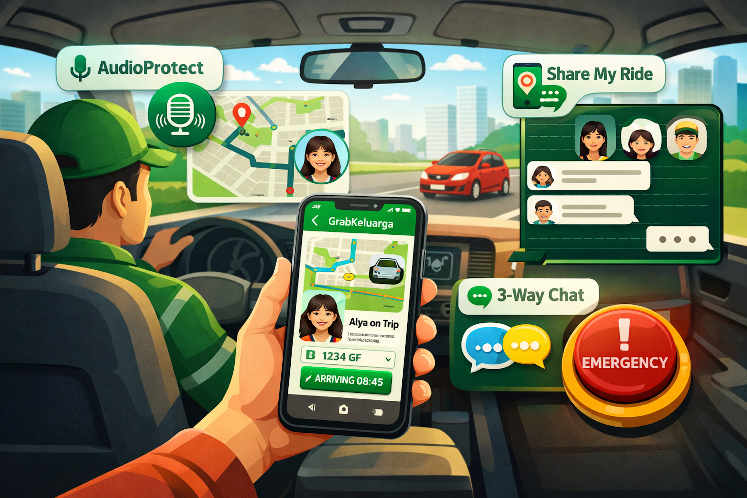 Selain itu, fitur Share My Ride memungkinkan detail perjalanan dibagikan kepada keluarga atau orang terpercaya, sementara Emergency Button memberi akses cepat ke bantuan darurat jika terjadi situasi genting. Seluruh sistem ini terintegrasi langsung di aplikasi Grab, tanpa memerlukan instalasi tambahan.