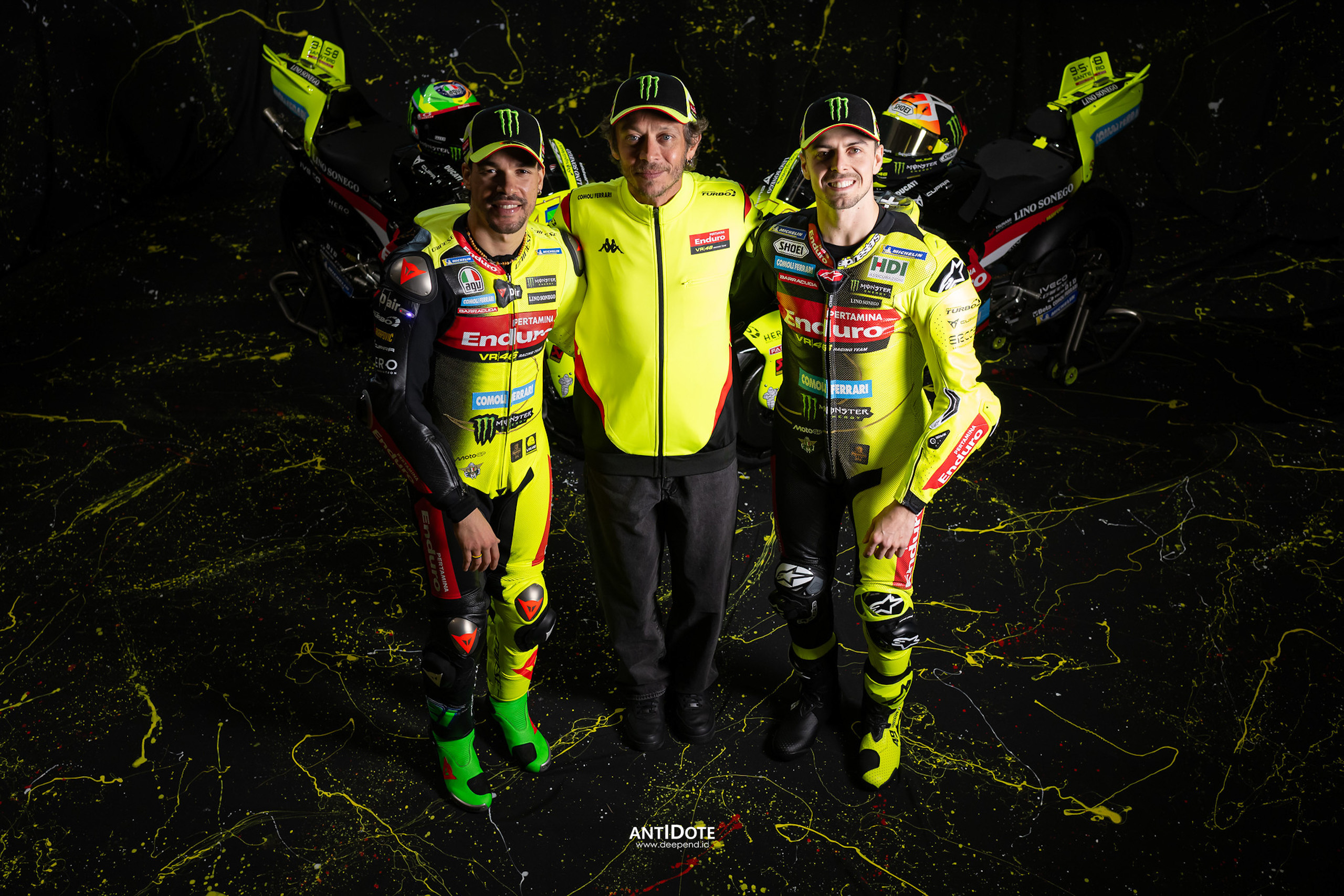 Warna hitam kembali mendominasi tampilan motor Fabio Di Giannantonio dan Franco Morbidelli, dipadukan dengan kuning fluoresen khas VR46. Desain ini dirancang oleh Aldo Drudi bersama Drudi Performance, dengan sentuhan ikonik berupa simbol matahari dan bulan milik Valentino Rossi yang tampil mencolok dalam balutan emas di sisi motor. Angka legendaris 46 juga kembali hadir di bagian depan sebagai latar nomor pembalap 49 dan 21.