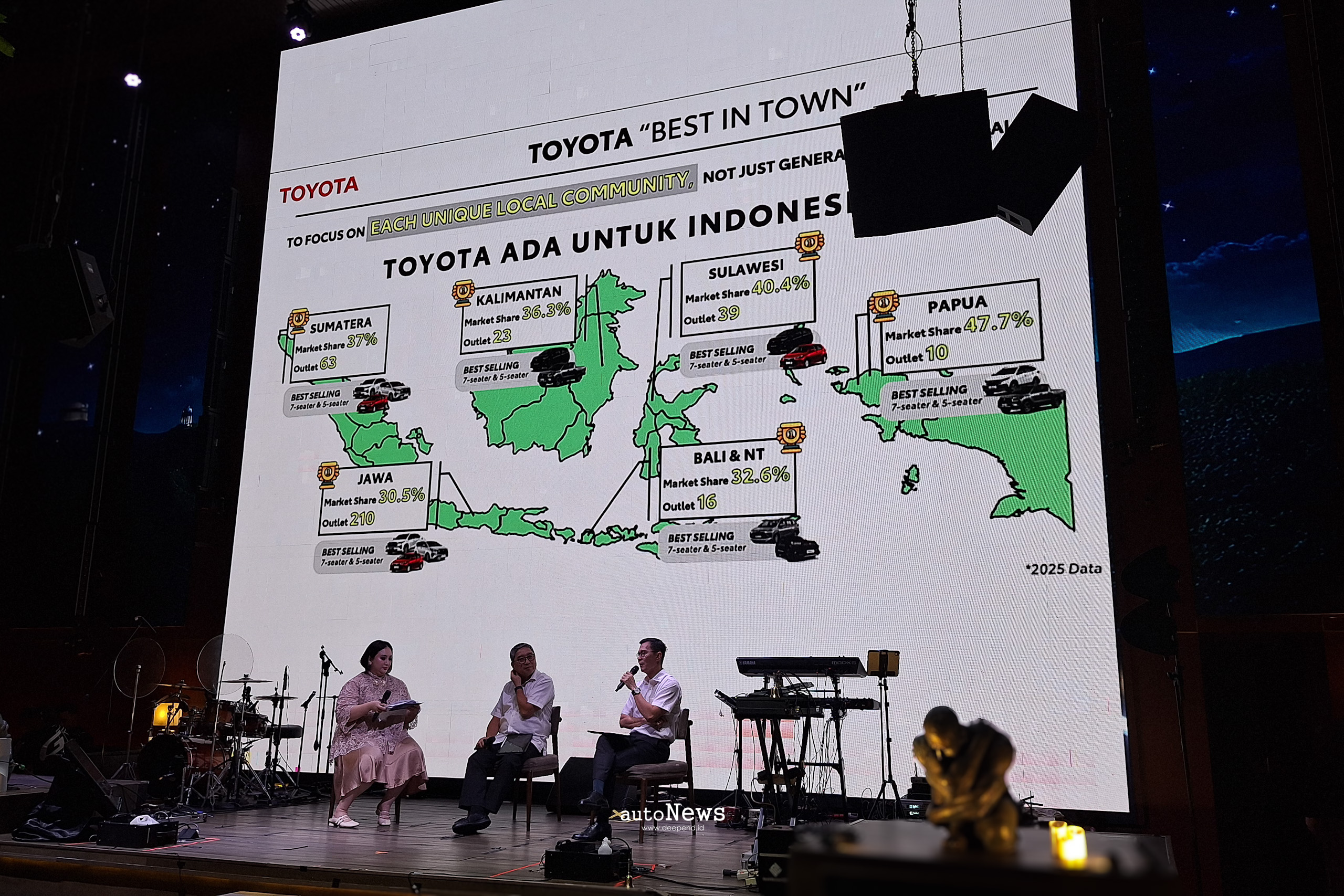 “Di mana pun Toyota berada di seluruh Indonesia, kami selalu sesuaikan dengan kebutuhan, kebiasaan, dan kondisi masyarakat di daerah setempat, kita memiliki diferensiasi dalam hal produk apa yang ditawarkan maupun bentuk after sales. Di daerah-daerah seluruh Indonesia pencapaian market share kami minimal di atas 30 persen, bahkan di beberapa titik ada yang mendekati 50 persen,” ujar Jap Ernando Demily, Marketing Director PT Toyota-Astra Motor.