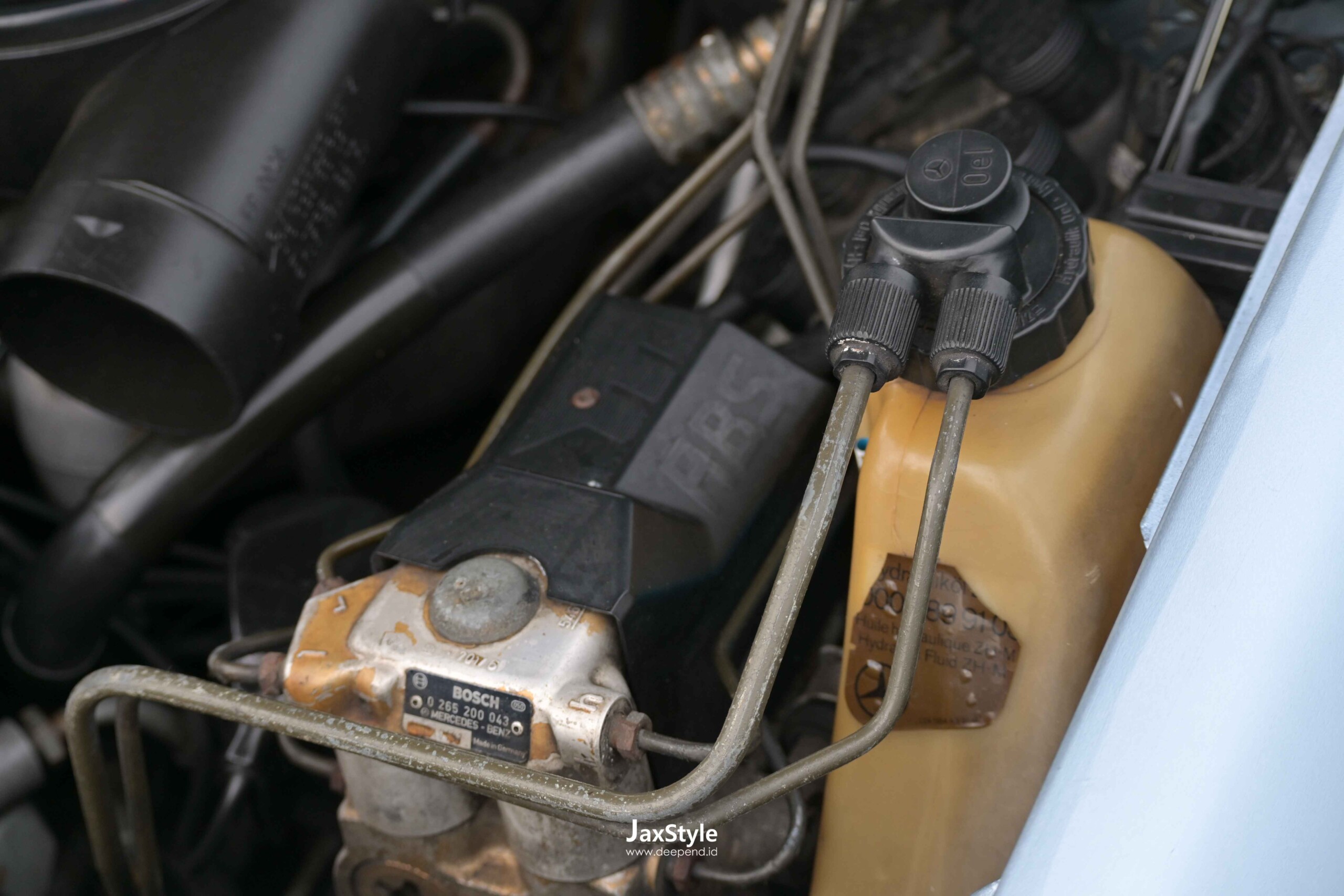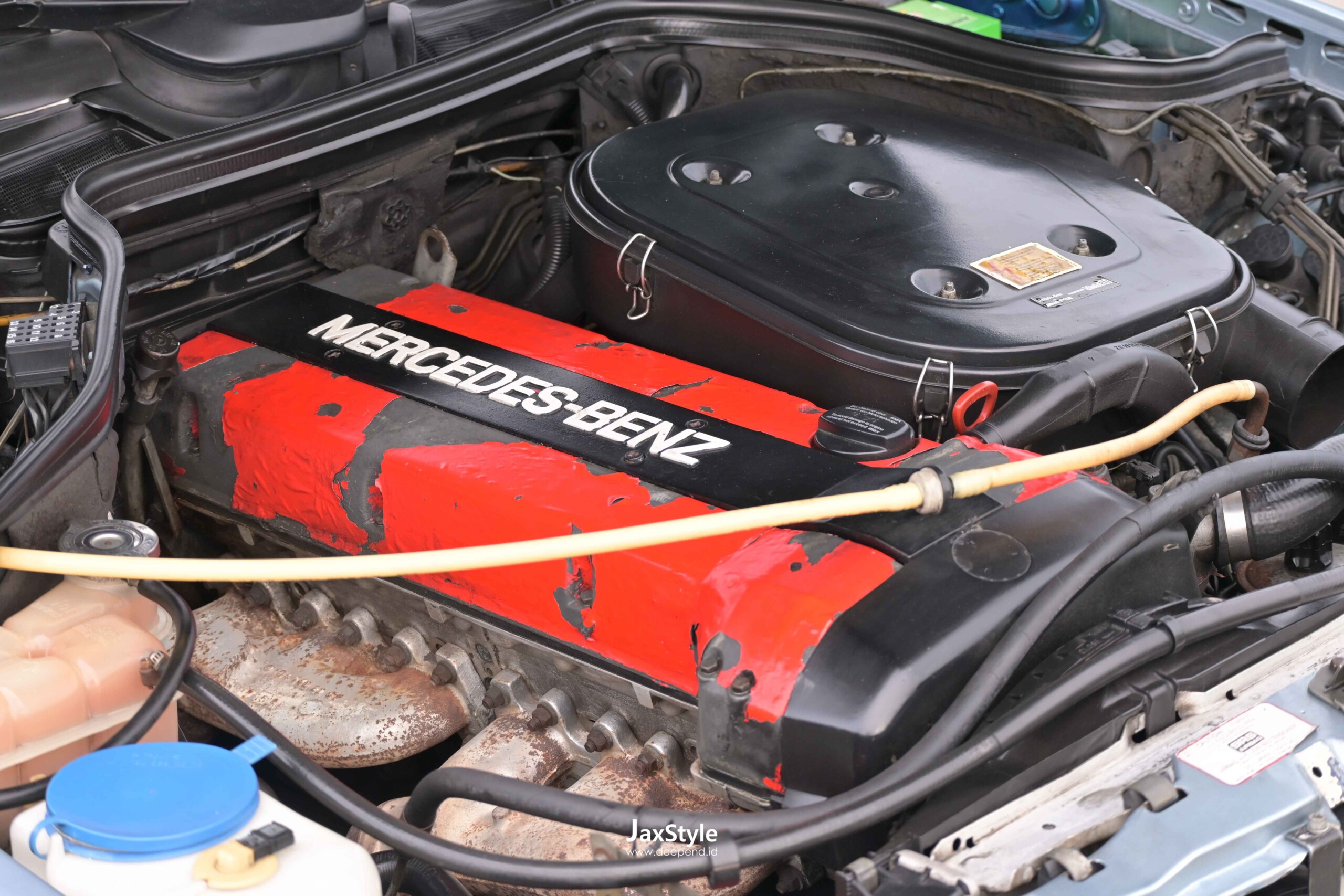 W124 berwarna Diamantblau ini tetap mempertahankan mesin M104 yang terkenal kuat, dipadukan dengan transmisi otomatis 4-percepatan. Sebelum modifikasi dilakukan, hampir seluruh komponen penting diperbarui agar kondisi mekanis benar-benar sehat, mulai dari arm, tie rod, steering shock, link stabilizer hingga bushing suspensi menggunakan komponen original Mercedes-Benz. Wiring harness dan berbagai gasket juga diganti untuk memastikan keandalan mesin.