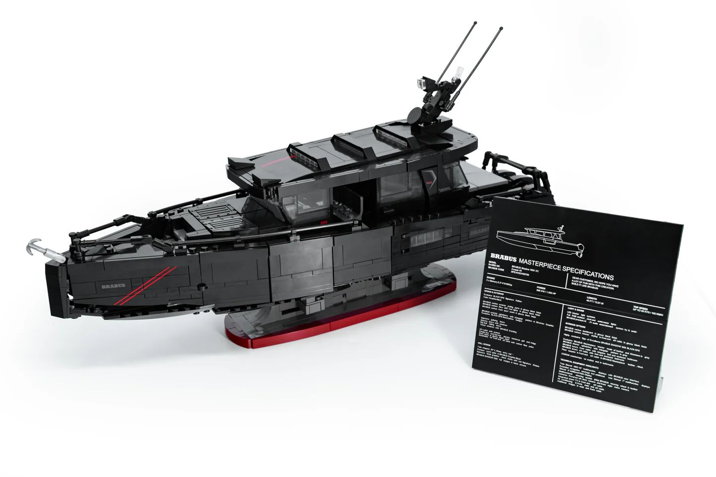 Dengan dimensi 445 x 135 x 228 mm, proporsi BRABUS Shadow 1500 XC Brick Set cukup besar untuk dipajang sebagai centerpiece dalam koleksi eksklusif. Detailnya yang akurat memperkuat kesan mewah dan gagah khas superboat BRABUS.